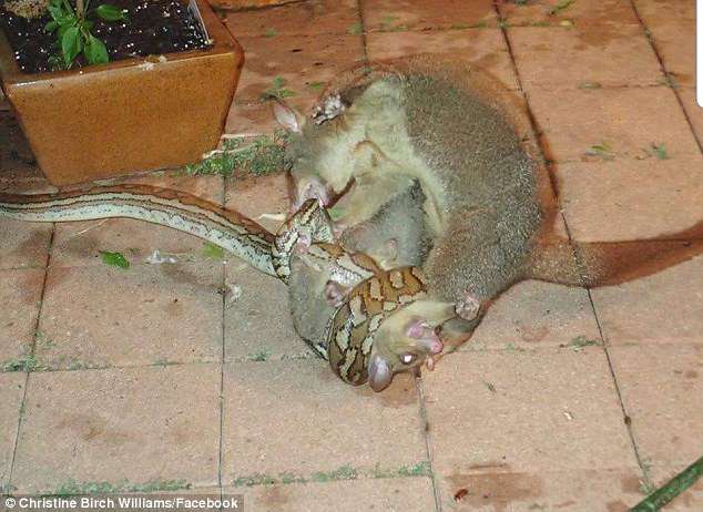 《每日郵報》報導,住在澳洲昆士蘭省的克莉絲汀威廉斯(Christine Birch Williams)日前晚上在家聽到後院傳出奇怪的聲音,前往查看後發現,一隻小袋貂正被一隻蟒蛇攻擊,袋貂媽媽見狀上演救孩大戰,照片中可見,小袋貂被蟒蛇纏住,脖子被勒得動彈不得,表情看起來相當痛苦,袋貂媽媽心急的撲上前,試圖讓蟒蛇鬆開,但蟒蛇依舊纏得緊緊的,眼見孩子就快奄奄一息,袋貂媽媽不怕眼前的強敵,竟一口狠狠咬住蟒蛇,最後蟒蛇痛苦不堪,只好將小袋貂鬆開落荒而逃。整個驚險過程,不僅被另外兩隻小袋貂目擊,還被克莉絲汀拍照紀錄了下來