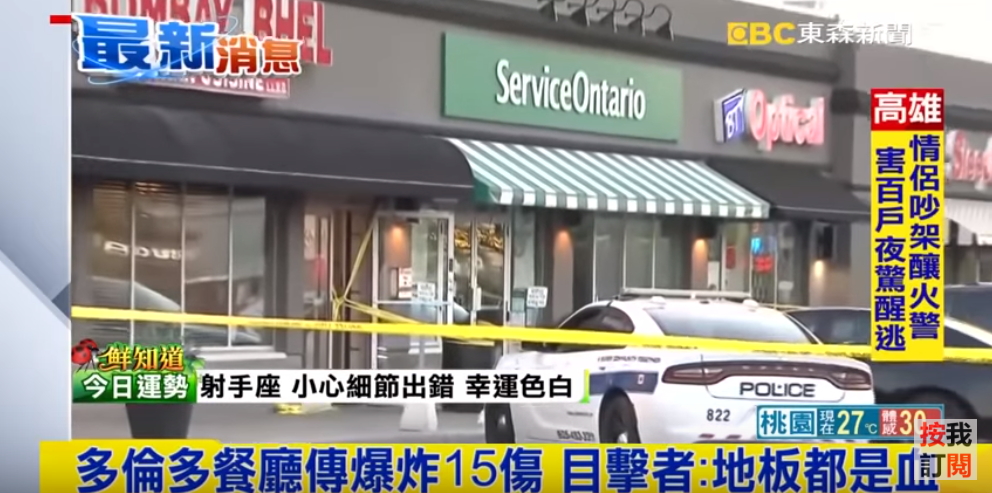加拿大多倫多西部大城密西沙加市一間印度餐館,25號深夜傳岀爆炸,當天晚上10點半,餐廳內有客人正舉行生日趴,兩名蒙面男子卻突然衝進店內,放下爆炸物後隨即快閃離開,餐廳緊接著就發生爆炸,造成10多人輕重傷。