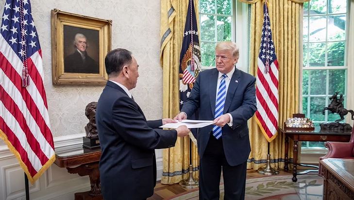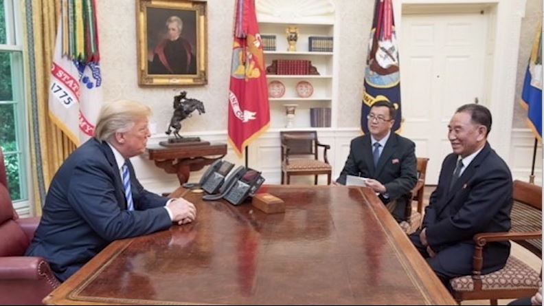 美國總統川普親自在白宮橢圓型辦公室,接見北韓金正恩的特使金英哲,一旁除了有翻譯作陪,還有美國國務卿蓬佩奧,雙方會談融恰,金英哲不時面露微笑。另外,金英哲也當面將一封金正恩的親筆信送交給川普,雙方會談超過一個小時。結束後川普親自送金英哲一行人步出白宮,並一起大合照,離走前川普還不斷和金英哲揮手道別,展現十足友好態度和誠意,隨後川普肯定表示6月12日的川金會將如期舉行。