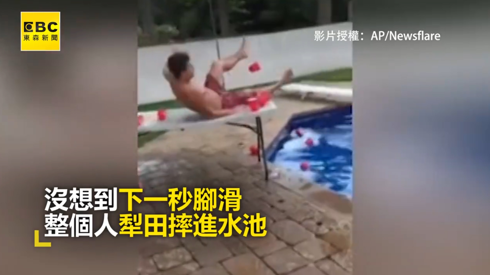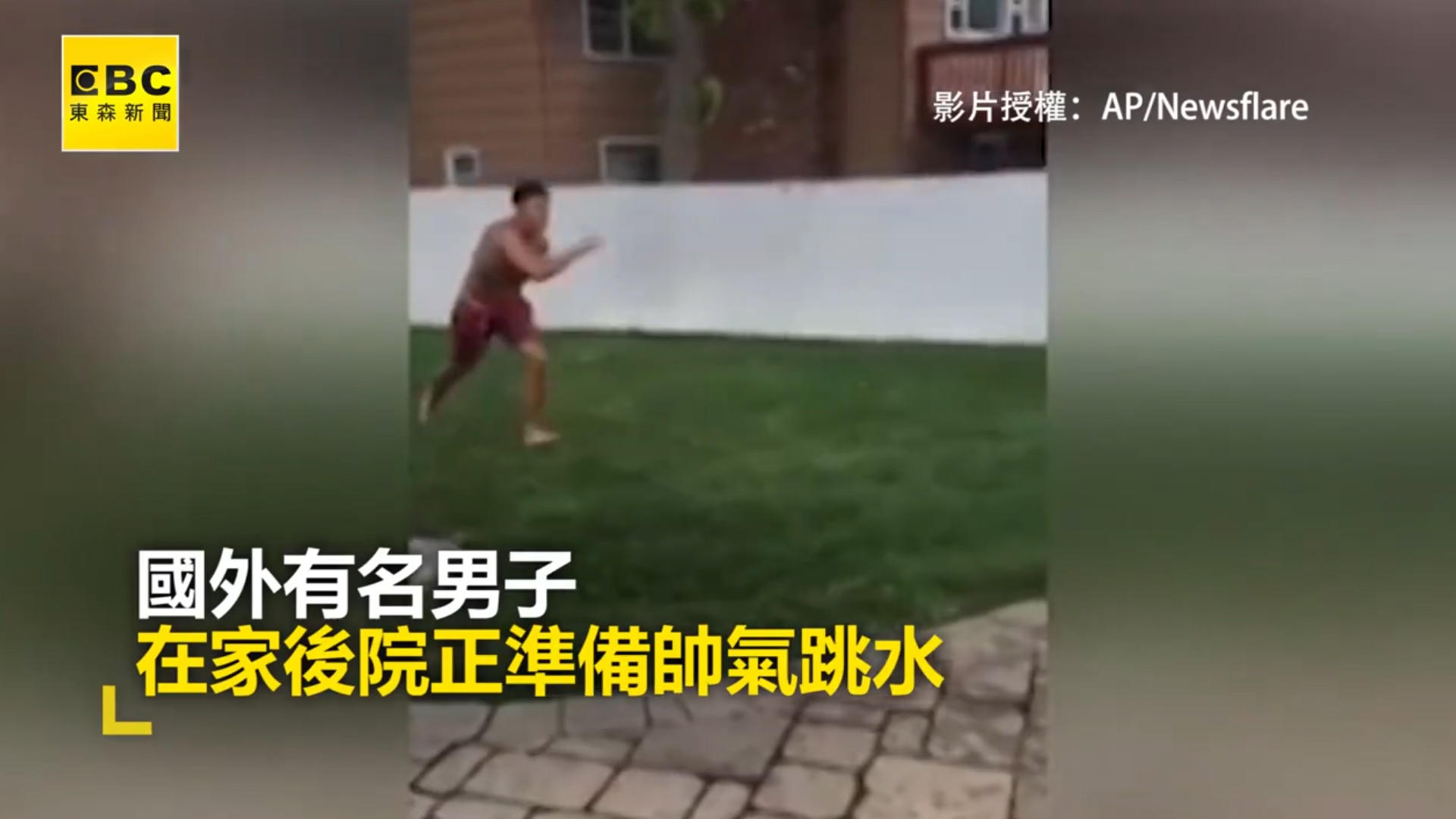 影片中只見這名男子在家後面玩水,他將桌子當成跳板,從遠處助跑準備跳入水中,男子帥氣起跑後,沒想到跳到桌子上卻突然腳滑,接著整個人跌倒滑進水裡,一旁的友人笑到不行並錄下整個過程。