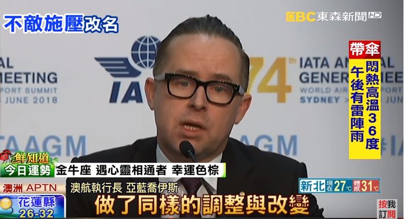 澳航執行長亞藍喬伊斯:「不是由航空公司來定義國家是什麼,澳洲自己就有一中政策,世界很多航空公司,在他們的網站上做了同樣的調整與改變,我們的目的也是一樣,而且澳洲政府也說了,他們讓個別航空公司來做決定。」