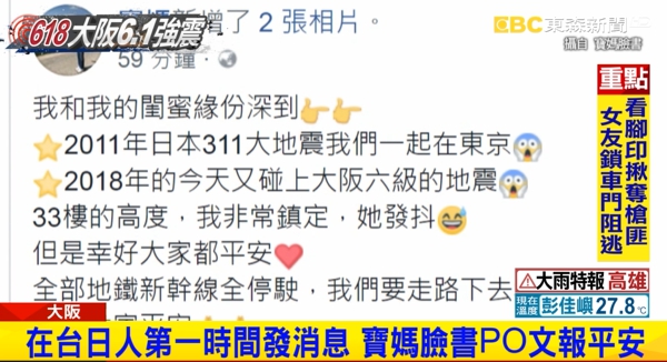 人正在大阪旅遊的藝人寶媽,也趕緊在臉書貼文和家人、朋友報平安,貼文寫著當時她和閨密,人在33樓一切平安,隨後得一路走下33樓逃生,底下網友也留言要他注意安全。