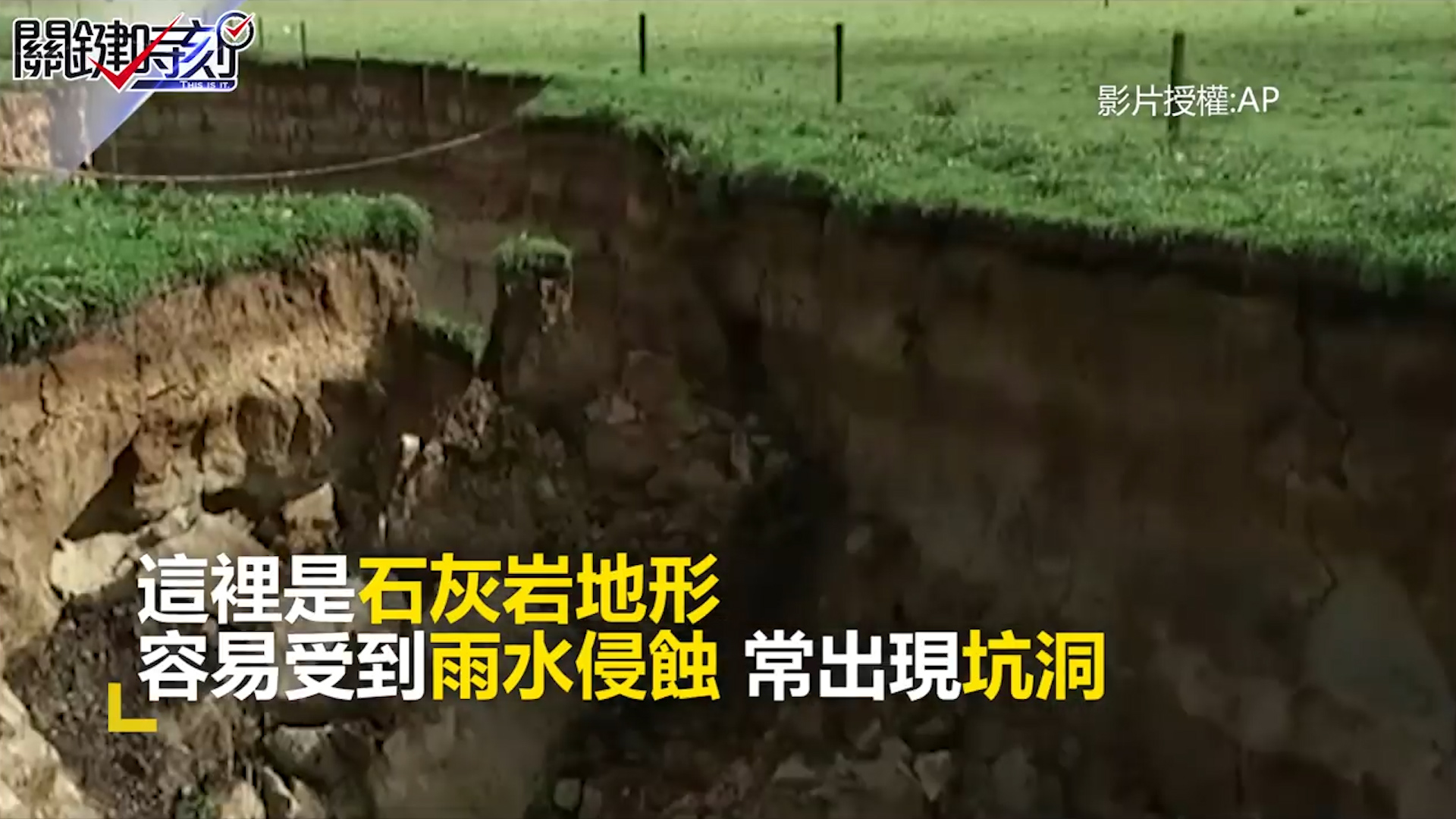 此地為石灰岩地形,容易受到雨水侵蝕,常出現坑洞,地質學者表示「過去40、50到100年的降雨中都會出現坑洞,而週末的超大規模降雨,加速了這個過程」。
