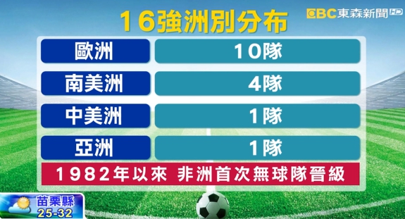 世足全軍覆沒後,亞洲球隊再度闖進16強,不過本屆沒有任何非洲隊伍晉級,也創下1982年來的新紀錄。