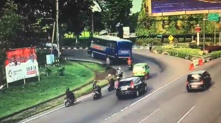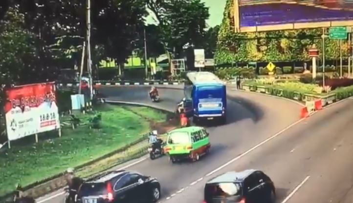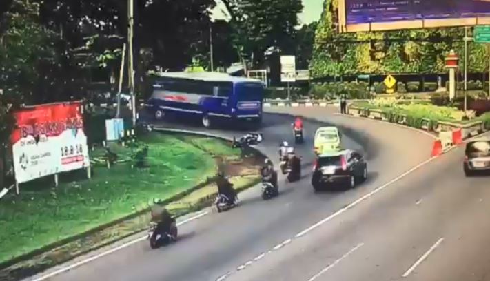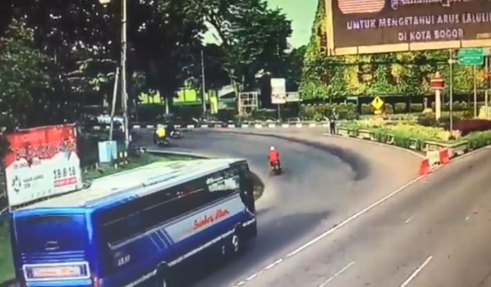 根據《Tribun Timur》報導,該起事故發生在上月27日,印尼茂物(Bogor)一路口處,從監視畫面中可見,當時車流量並不大,彎道處陸續有汽機車通過,沒想到後來一輛公車行經,在左轉彎過程中隱約可以看到,一輛機車正騎在公車左側,公車轉彎時朝機車貼近,但過沒多久就發生擦撞,騎士和後座乘客被撞飛倒地,恐怖的是,公車在事發當下並未停車查看,反而繼續往前開,左後輪又因此輾過倒地的後座乘客。