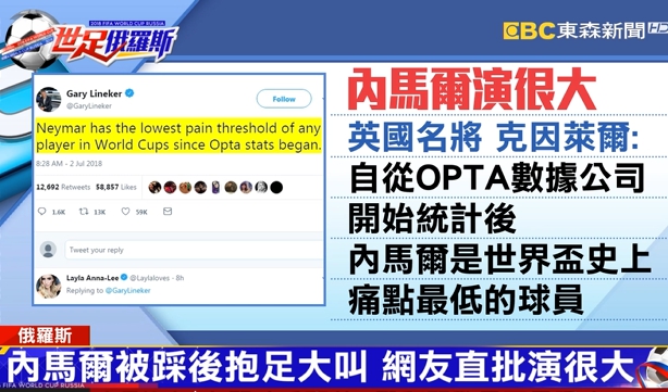 球員內馬爾,關鍵進球帶領球隊晉級,16強淘汰賽以2比0擊退墨西哥,不過他在「被踩」後誇張的表現,卻讓網友直呼他演很大,就連英國退役名將都忍不住批評,他是世界盃有統計數據以來痛點最低的球員。