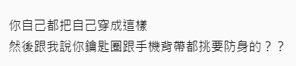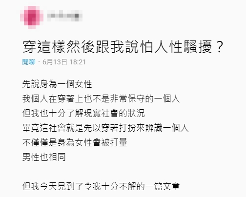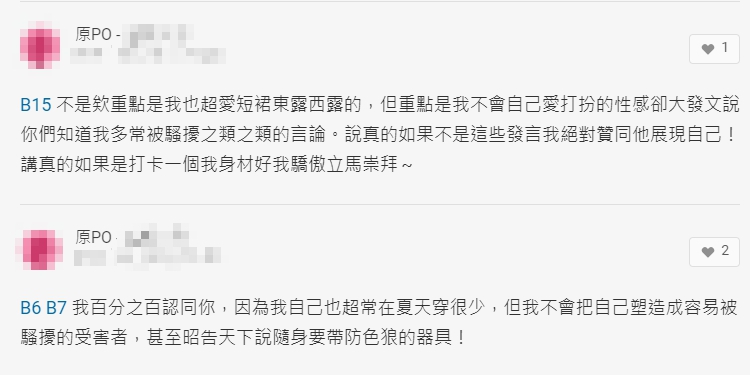 還有人表示「如果妳沒先嘗試了解她的經歷,就發這樣充滿歧見的文字,只是顯得妳有多無知,別人想如何穿著也輪不到妳貼上來審查」、「我又想請問妳了,怎麼樣才算是一般的穿著、才算是安全範圍?」、「不懂穿著和性騷擾的關聯是什麼,穿的少就可以合理化性騷擾的舉動?」
