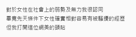 《Dcard》,表示「我見到了令我十分不解的一篇文章」,砲轟該網美的穿著清涼、露出深邃事業線,「穿這樣然後跟我說怕人性騷擾?」還說這社會不分男女,「就是先以穿著、打扮來辨識一個人」,強調認同網美「女性在社會上的弱勢及無力」的論點,卻又再次質疑「妳把自己穿成這樣,然後跟我說你鑰匙圈跟手機背帶都挑要防身的?」