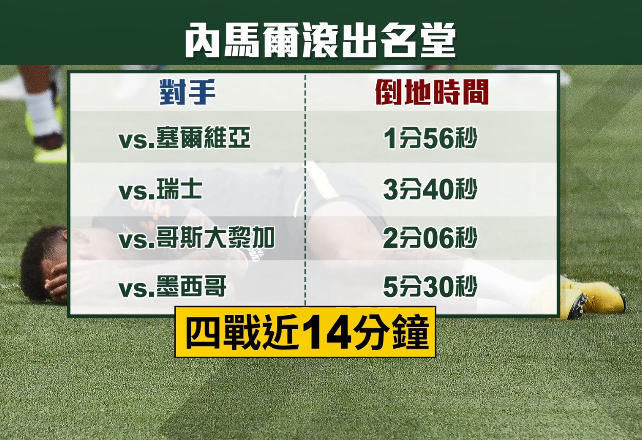 由於內馬爾真的太常躺在地上,外國媒體還特地為他做了一項統計,在森巴軍團至今為止,進行的比賽中他每場倒地時間最少將近2分鐘,最多超過5分鐘,4場比賽加起來甚至超過13分鐘。