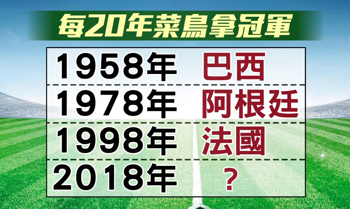 世界盃冠軍開始,每20年的冠軍得主,剛好都是從沒拿過金盃的國家,2018剛好又是20年,會不會出現菜鳥冠軍國呢?大家都在等著看。