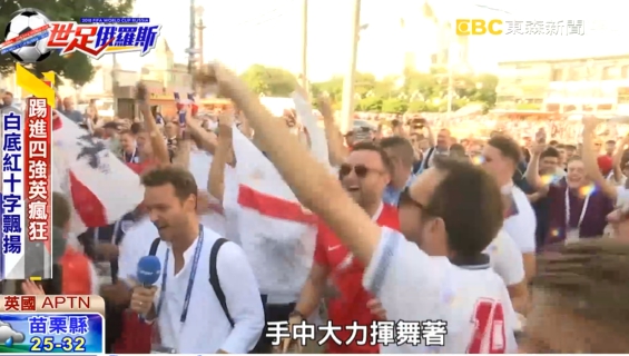 歡呼尖叫、跳上跳下,大家全都抱在一起,看見贏球英格蘭球迷全瘋了,手中大力揮舞著,白底紅十字旗因為這面旗代表著英格蘭,在世界盃期間英國各地到處都是這面白底紅十字旗飄揚,球迷臉上不但畫上白底紅十字,還會戴上白底紅十字圖案的帽子,為英格蘭加油。