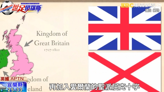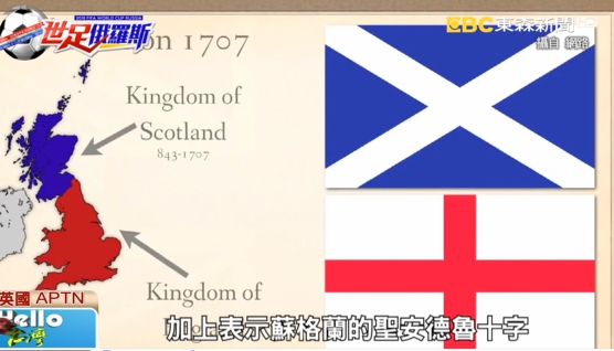 現在我們看到的英國國旗,是由代表英格蘭的聖喬治十字,加上表示蘇格蘭的聖安德魯十字,兩面旗成為了英國歷史上大不列顛王國的國旗,最後大不列顛國旗,再加入愛爾蘭的聖派屈克十字,因此變成了今天的米字旗。