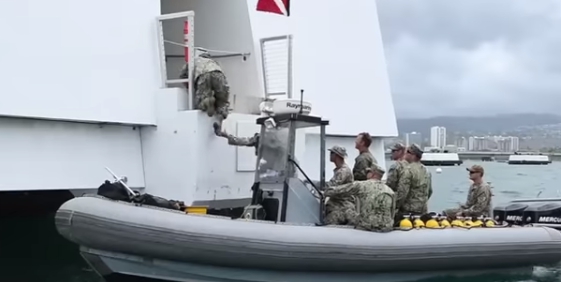軍演持續進行,能夠清楚看見澳大利亞籍的成功號補給艦以及美軍的阿利伯克級驅逐艦,亞利桑那號紀念館,最著名的就是從水下殘骸漏出燃油,形成亞利桑那之淚,但船體終年遭海水侵蝕,也有人提出疑問。