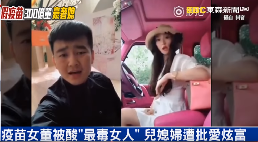 在閃亮亮的超跑裡高歌一曲,穿著一身貴氣的女子是大陸製造假疫苗,長生生物公司董座的兒媳婦,愛玩抖音的她分享了不少影片。