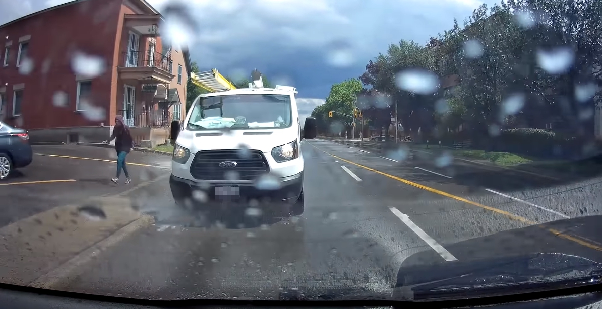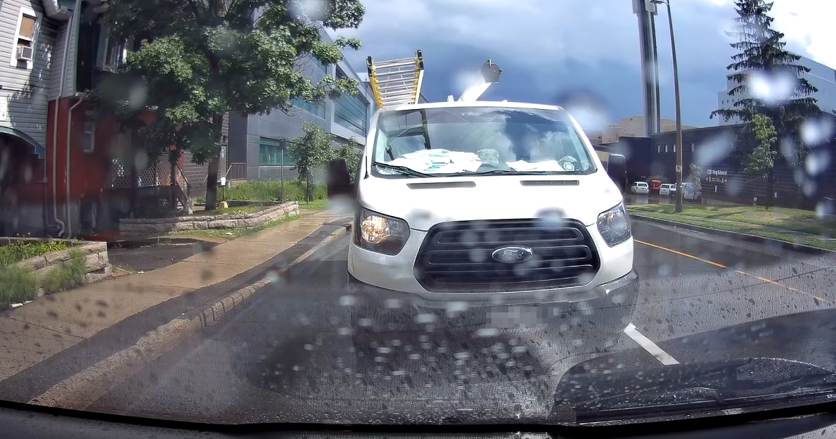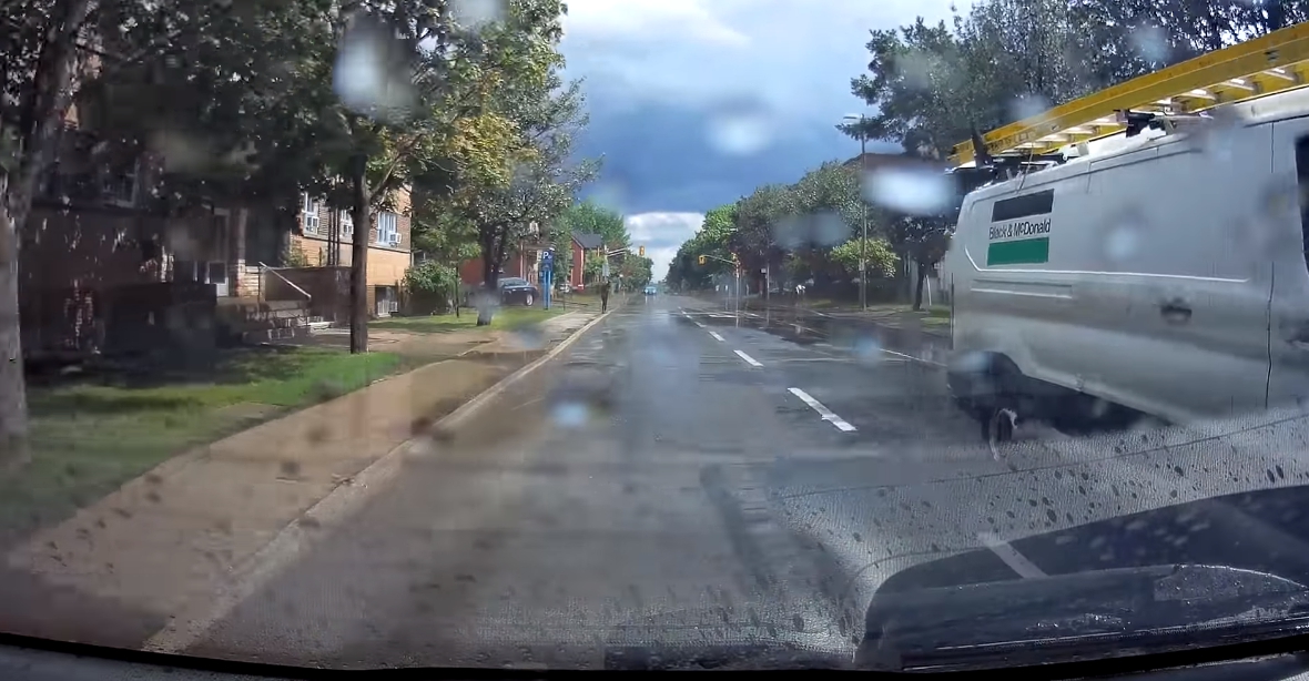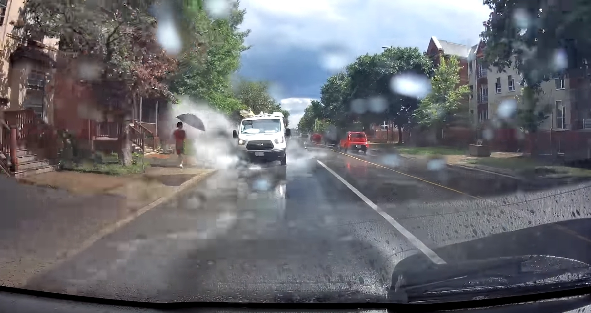 從畫面中顯示,短短的45秒內,貨車司機就噴濕4名路人,他看見2名路人撐著雨傘好端端地走在路上,司機眼見逮到機會,馬上偏向路旁並加速行駛,而2名路人無辜地被濺起的水花從頭淋到腳。司機似乎越玩越起勁,接連波及另2名人行道上民眾,相當惡劣。而影片中值得注意的是,在貨車司機要超車時,恰巧拍下公司名稱「Black & McDonald」。
