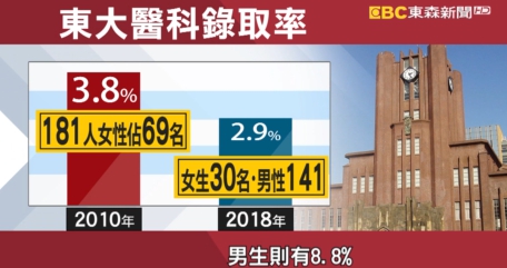 從歷屆錄取率中似乎能窺見端倪,2010年東京醫大女生錄取率高達38%,181人中有69名女性,但自2011年起女生錄取率急速下滑,到了今年僅剩2.9%、30人上榜,男生則有8.8%。