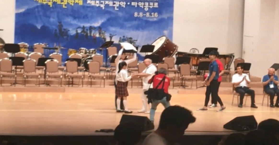 孩子們開心尖叫,因為他們遠赴韓國參加濟州管樂節U13管樂比賽,榮獲第一並獲得最佳指揮大獎,台上高水準演出,這群台灣之光是來自新北市忠義國小,這次參賽拿到第一名以及最佳指揮,在這之前,他們參加國內音樂比賽,105、106學年度也得到特優,因此學校家長特別規劃到國外參加國際型比賽。