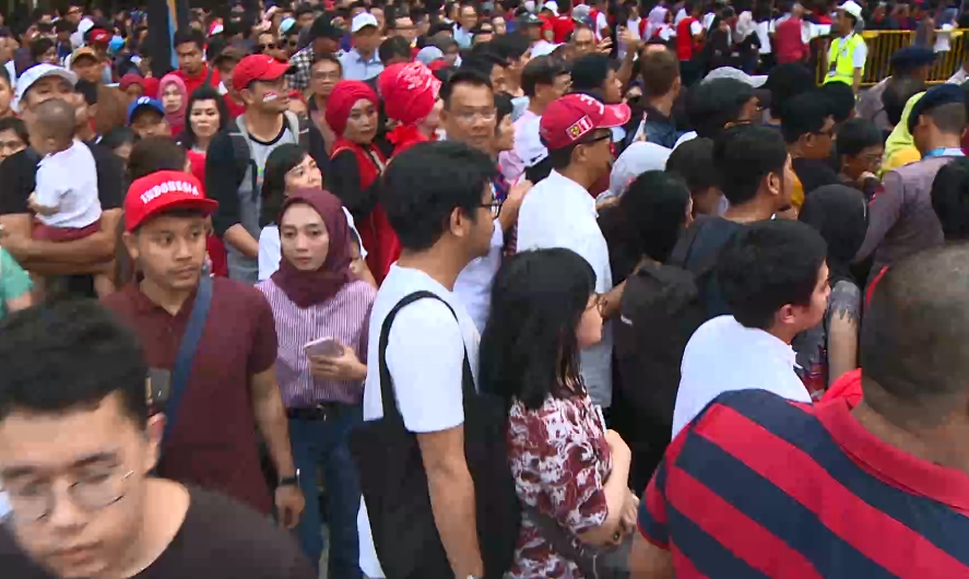印尼雅加達亞運開幕式起跑,人潮多到讓你難以想像,就在開幕倒數前幾分鐘,民眾不斷湧入,就是要搶一個好位置,別小看這座體育場,一共可以容納7萬人,場內一定相當嗨,嗨的程度從開幕前2小時就感受得到,排隊進場的人潮早就擠滿入口,要來搶先體驗。