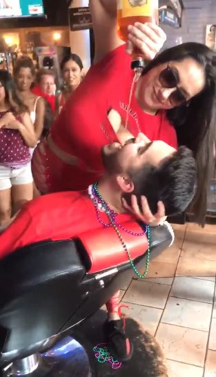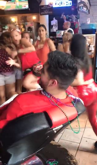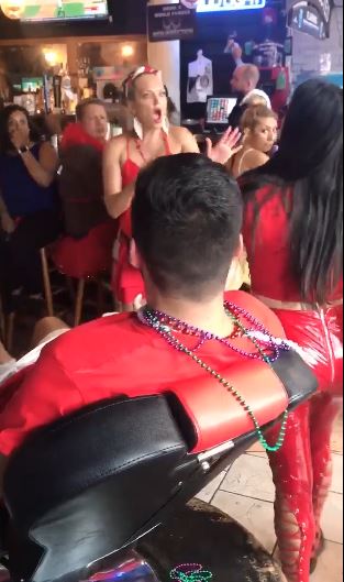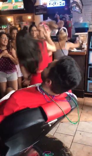 綜合外媒報導,這間名叫「Spirits on Bourbon」的酒吧中有一張紅色的理髮椅,員工常會想一些與酒有關的遊戲,讓顧客坐在椅子上體驗,成為該店特色,日前一名身穿紅色