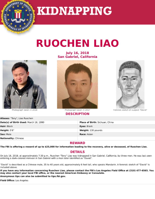 聯調局洛杉磯辦公室發言人艾米勒(LauraEimiller)表示,28歲的廖若晨(Ruochen "Tony"Liao,音譯)在科斯塔梅薩(Costa Mesa)一家高檔車行任職,他7月16日在聖蓋博市(San Gabriel)被3名乘坐兩輛黑色汽車的男子綁架。