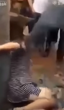 孕婦被人群團團包圍,一名男子憤怒的咆哮、毆打孕婦,完全不顧肚裡孩子的安危,最後孕婦無力地昏倒在地,怒氣衝天的男子還補上一腳,畫面令人不敢卒睹。