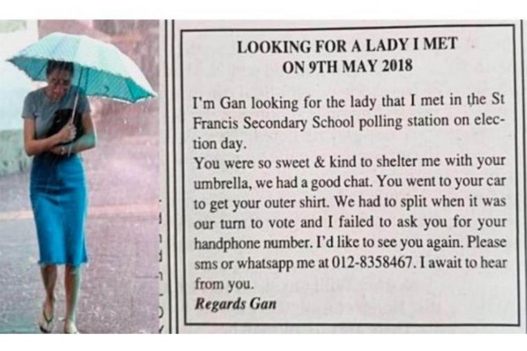 馬來西亞有一名顏姓男子(Gan),在去年遇見一名短髮女子替他撐傘,從此對女方無法忘懷,因此在過了100多天後,他決定以「尋找2018年5月9日相遇的女子」為題登報尋人,他在文中提到他只是想再見這名女子一面,和對方做個朋友,「我一直想著她,希望能夠再見到她…」。
