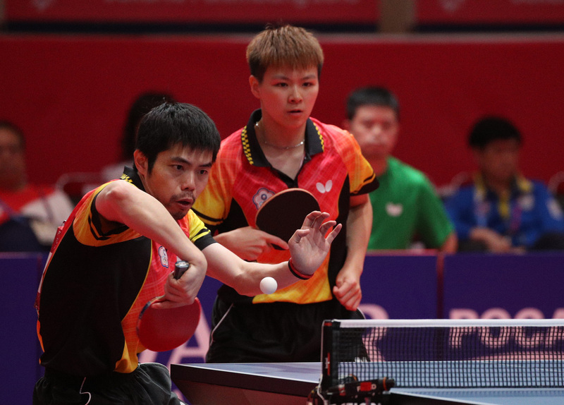 中華隊6屆老將莊智淵身穿紅、黃、黑色上衣,男單32強賽對上蒙古球員艾爾登,殺得對方無力招架。