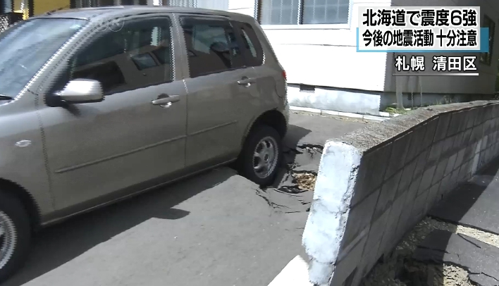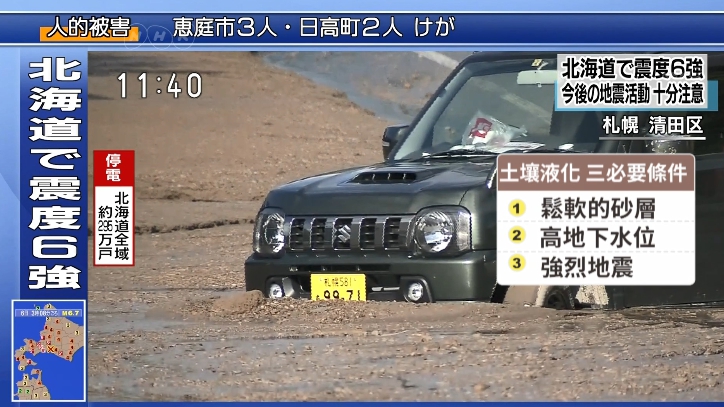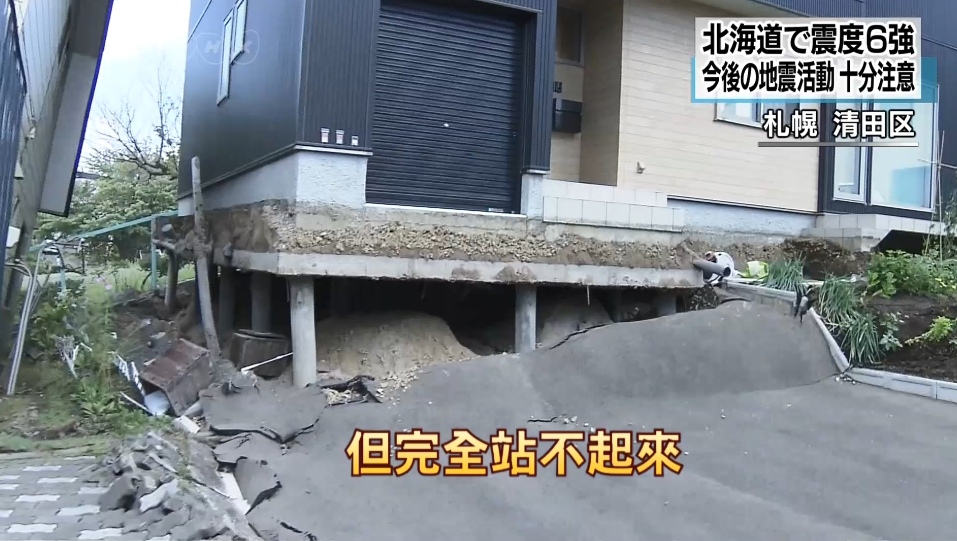 北海道發生規模6.7強震,大約兩個小時後札幌清田區,竟出現嚴重的土壤液化。朝日電視台記者:「因為土壤液化、沙土堆積,覆蓋住巴士通行的道路,橘色的公寓1樓停車場的部分,完全被土沙埋住。」