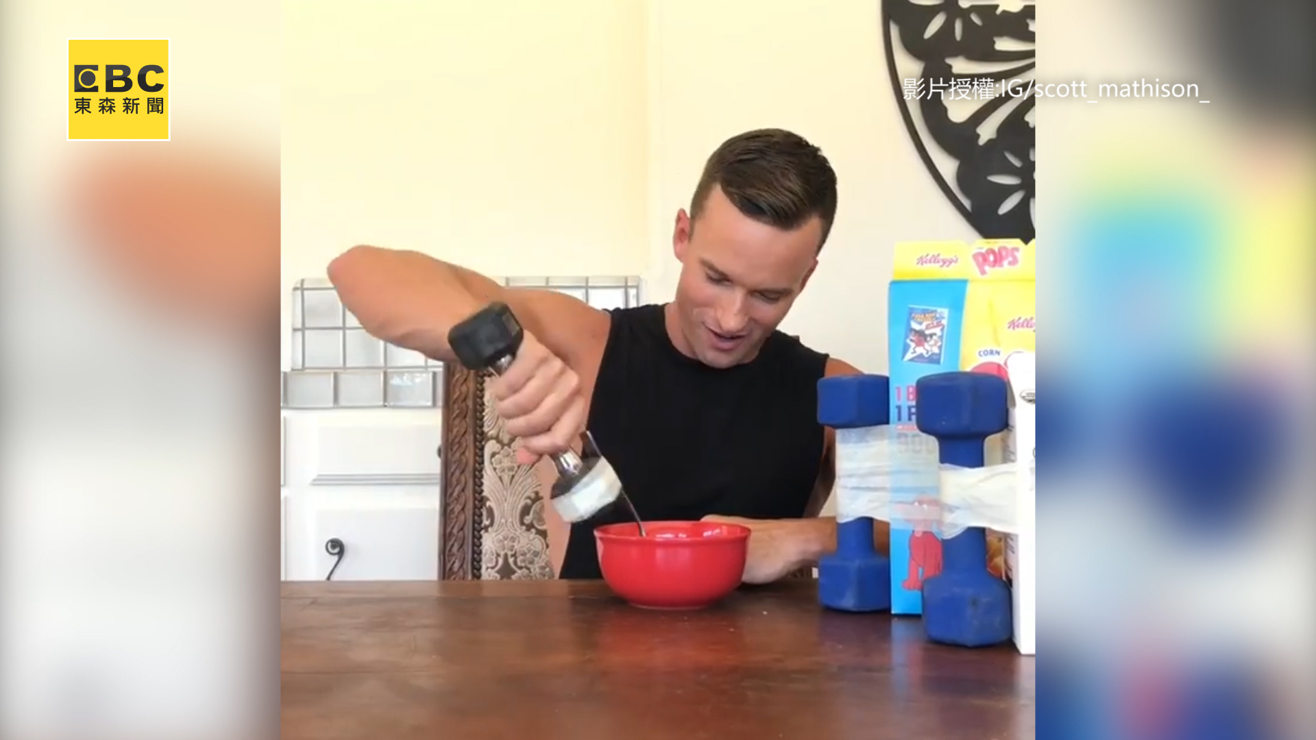 影片中,Scott Mathison不管是起床、刷牙還是刮鬍子,都要拿著啞鈴做訓練,就連吃早餐也沒閒著,堅持把餐具綁在啞鈴上,再將食物一匙一匙的慢慢送入口中。搞笑健身影片讓網友噴飯,「難怪他有大肌肌」、「這個太666啦!」、「難怪他有大肌肌」、「實在太可怕!」、「簡直是健身狂魔」。