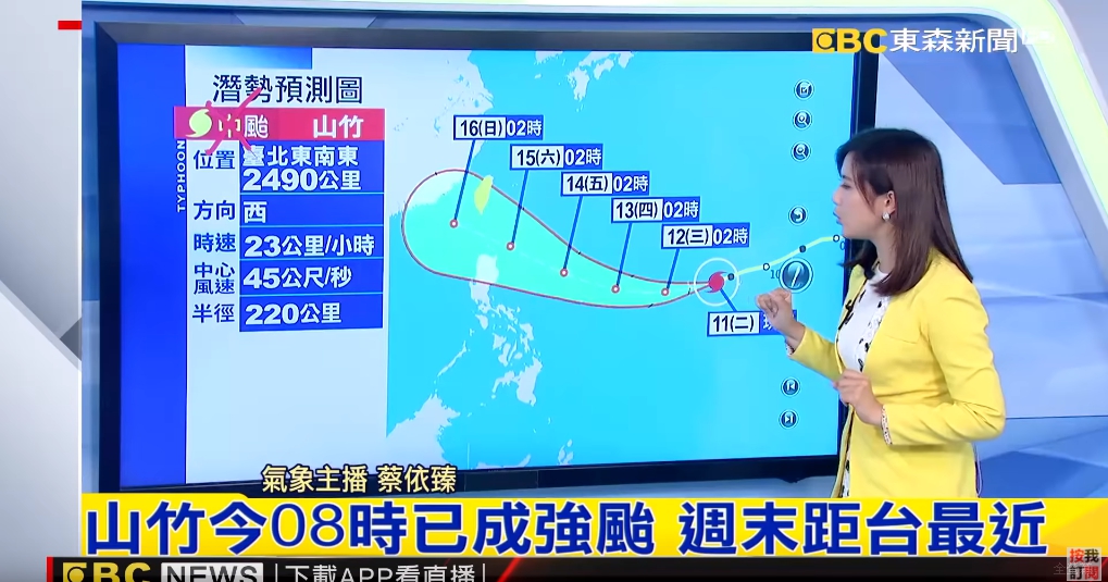 氣象局簡任技正伍婉華說:「22號颱風山竹接近過程中,我們預估星期四開始,東半部海域南邊海域甚至北邊海域開始會有長浪現象,星期五到星期六隨著颱風更接近台灣附近風浪更為增強。」,除了南部雨勢明顯,北部和東半部地區也將有陣雨或雷雨,各地民眾都要做好防颱準備。