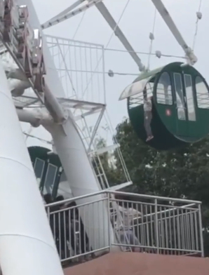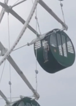 這起事發於24日上午10時許,從當時畫面可見,該名男童所搭的摩天輪已經轉到半空中,離地面還有一段距離,只見男童原本調皮地想往外爬,隨後整個身子都懸掛在窗外,男孩起初賣力想掙扎脫困,不料卻漸漸沒有任何動作,嚇得群眾不禁發出一陣驚呼。
