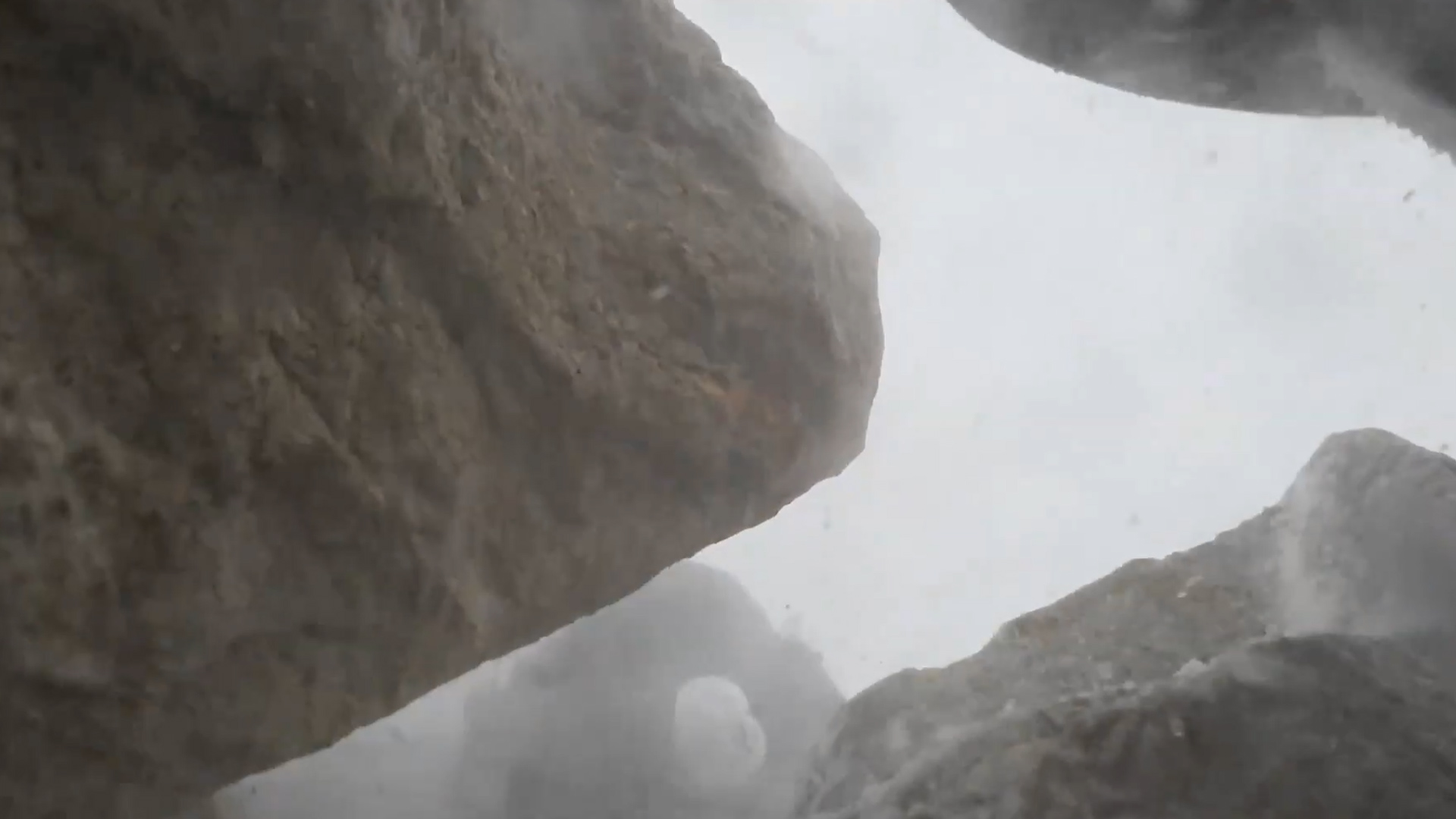 只見大量積雪從山頂上沖下,就像河流一樣。登山客們趕緊躲到石縫中,細碎的雪花穿過縫隙打在登山客身上,場面十分驚險。