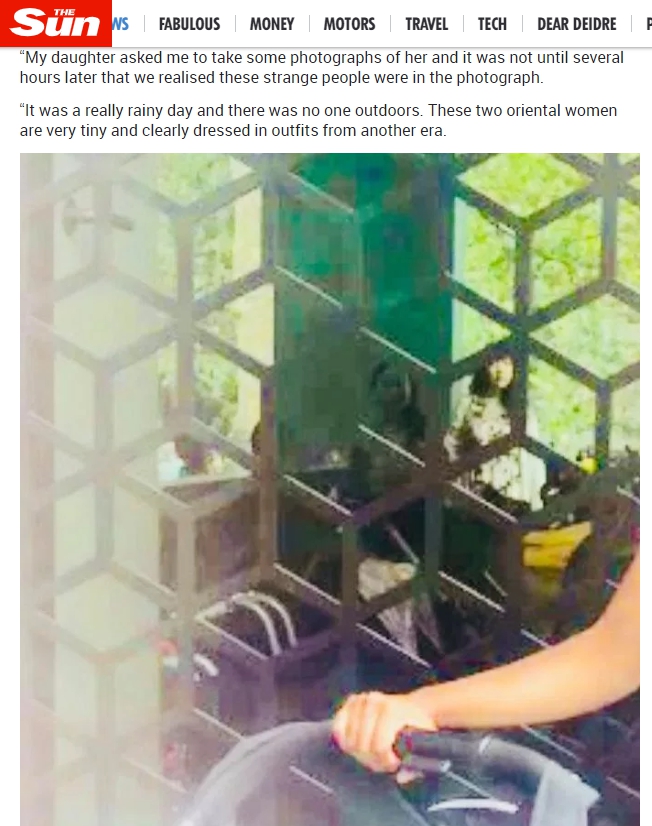 根據英國《太陽報》報導,53歲的柯寧罕表示,當時她挑了一個角落,請女兒幫忙拍照,但當柯寧罕回家看照片時,瞬間被嚇歪,從她身後的窗戶縫隙間,竟看到2名有著東方面孔的女孩身影,穿著相當古老,且她們也面對著鏡頭,令人看了毛骨悚然。