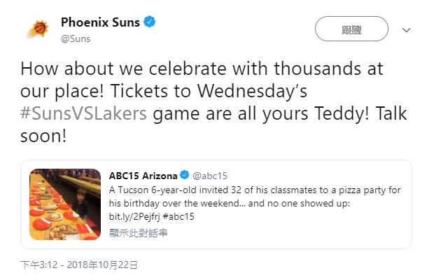 連NBA「鳳凰城太陽隊」得知消息後,都在推特上發文祝賀,還邀請泰迪到球場觀看對戰湖人隊的比賽,球迷也樂意送泰迪訂製球衣,還說沒有同學願意幫他慶生沒關係,比賽當天會有上千人為他慶祝。