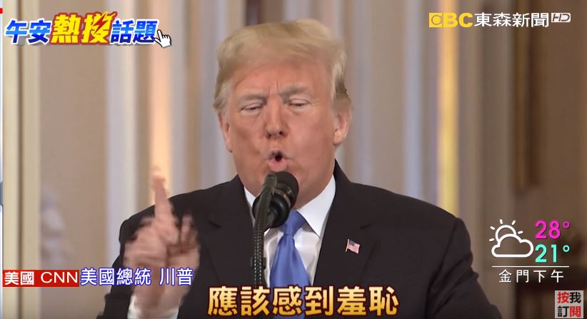 美國總統川普:「當你報導假新聞時,就像CNN報導很多假新聞一樣,你就是人民的敵人,繼續下個問題。」