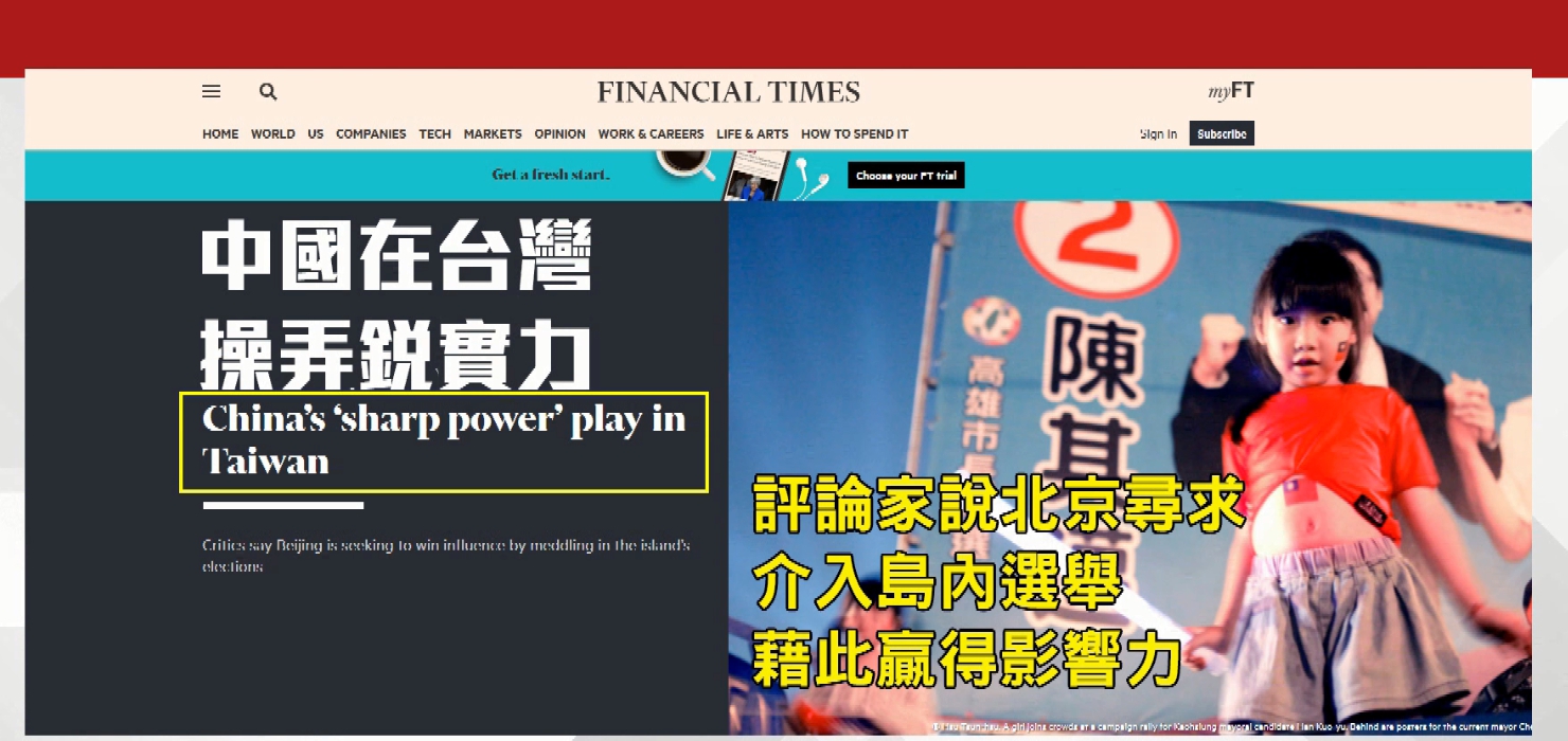 台灣選舉搶搶滾,國際媒體也高度關注,英國金融時報就以「中國在台灣操弄銳實力」為標題,訪問評論家說北京尋求介入島內選舉,藉此贏得影響力。金融時報說,前台南縣議員陸愛華8年前自政壇退休,隨著選舉進入衝刺階段,陸愛華就此遭到調查,釐清他是否協助北京干預地方選舉。而陸委會副主委邱垂正則說,台灣正處在銳實力的最前線,銳實力是由美國民主基金會所提出,意味著威權政體的影響力,捅穿滲透或穿透別國的政治和信息環境。金融時報指出,如今中國以銳實力戰術,目標改鎖定小群體甚至個人,深入草根或是依靠網路媒體來進行統戰。