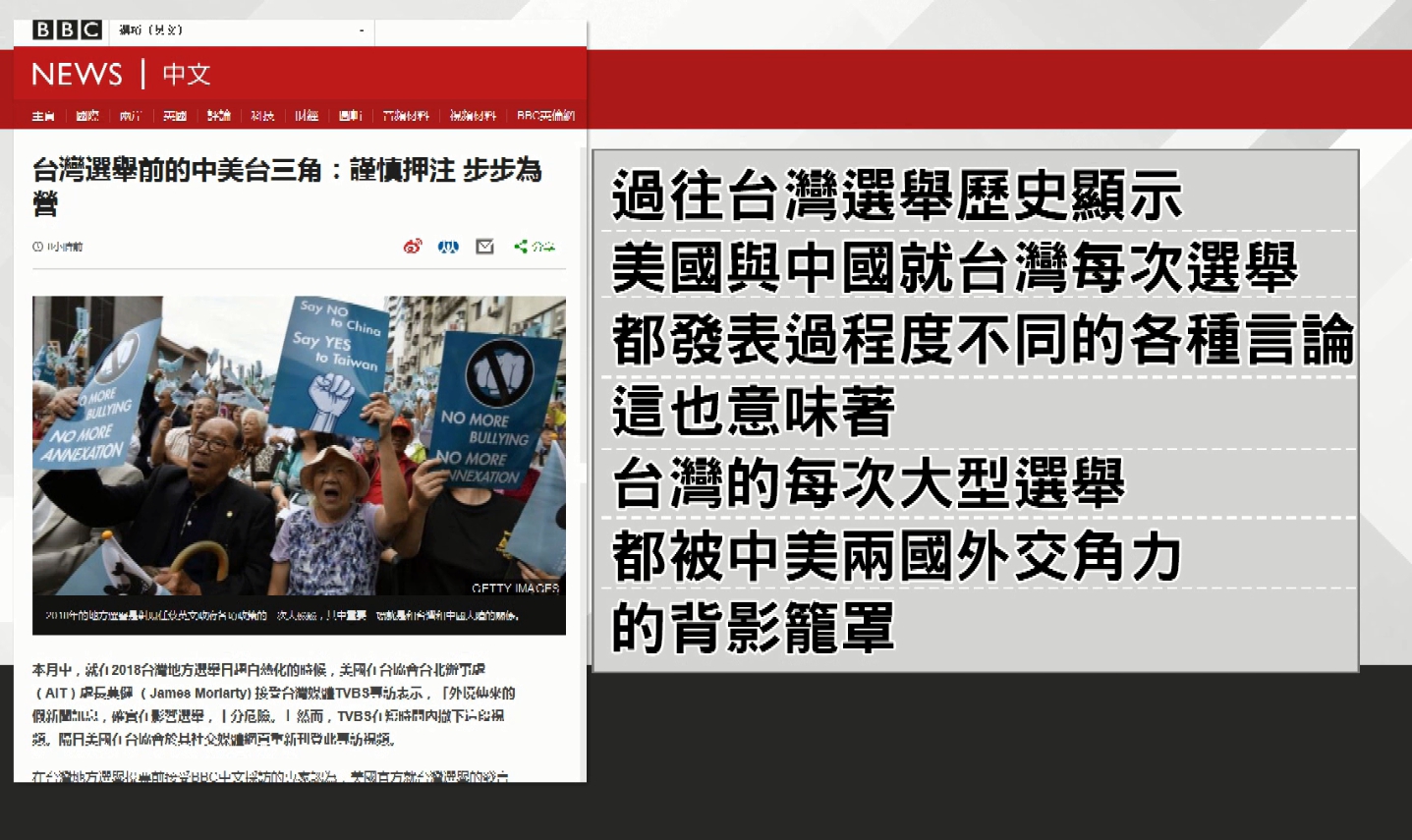 而BBC中文版,也針對台灣選舉做一系列報導,內文中提到過往台灣選舉歷史顯示,美國與中國就台灣每次選舉都發表過程度不同的各種言論,這也意味著,台灣的每次大型選舉,都被中美兩國外交角力的背影籠罩。另外BBC中文版也觀察到,台灣政治選舉趨向綜藝化和娛樂化,越來越年輕的網絡世代,對傳統的選舉產生影響力,候選人開始藉由和網紅合作來增加曝光率,網紅也透過和政治人物的跨界合作,拓展網路影響力,也成為台灣這次九合一選舉的新現象。