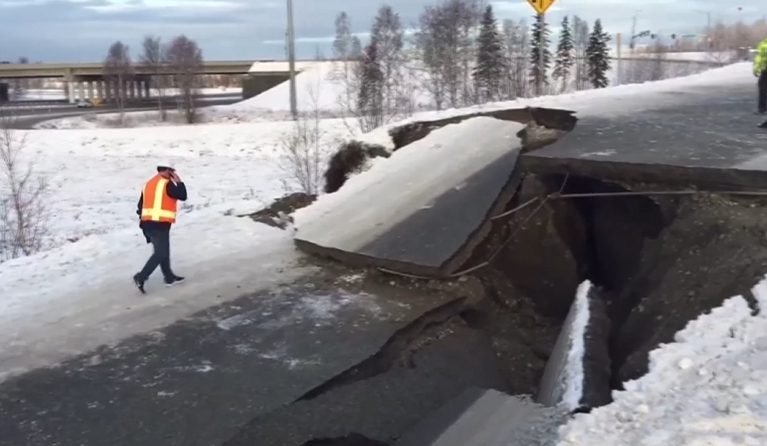 安克拉治市府律師皮爾森:「我們目前並沒有發布宵禁或撤離警告,當然如果有需要,也會考慮重新評估情況,但目前還沒有必要。」事發當時,正是上班通勤時間,地震震壞了許多主要道路和橋梁,到處都可以看到汽車塌陷在斷落的馬路上,險象環生,從空拍畫面更可以清楚看見,道路被震得面目全非,甚至還有教堂,在強震過後失火冒出濃煙,消防人員立刻灑水灌救。
