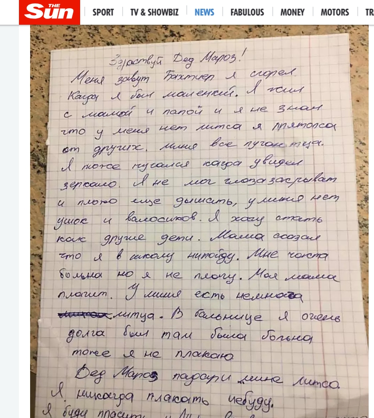 聖誕節快到了!許多孩子都會向聖誕老人許下心願,過烏茲別克一名5歲男孩辛卓夫(Bakhtiyer Sindrov)有個不同於其他小孩的特別願望,在他還是嬰兒的時候,家中發生大火,他的臉部遭嚴重燒傷,失去了鼻子、耳朵,也長不出頭髮,現在他只希望聖誕老人可以給他一張和其他人一樣的新臉,讓他可以去上學。