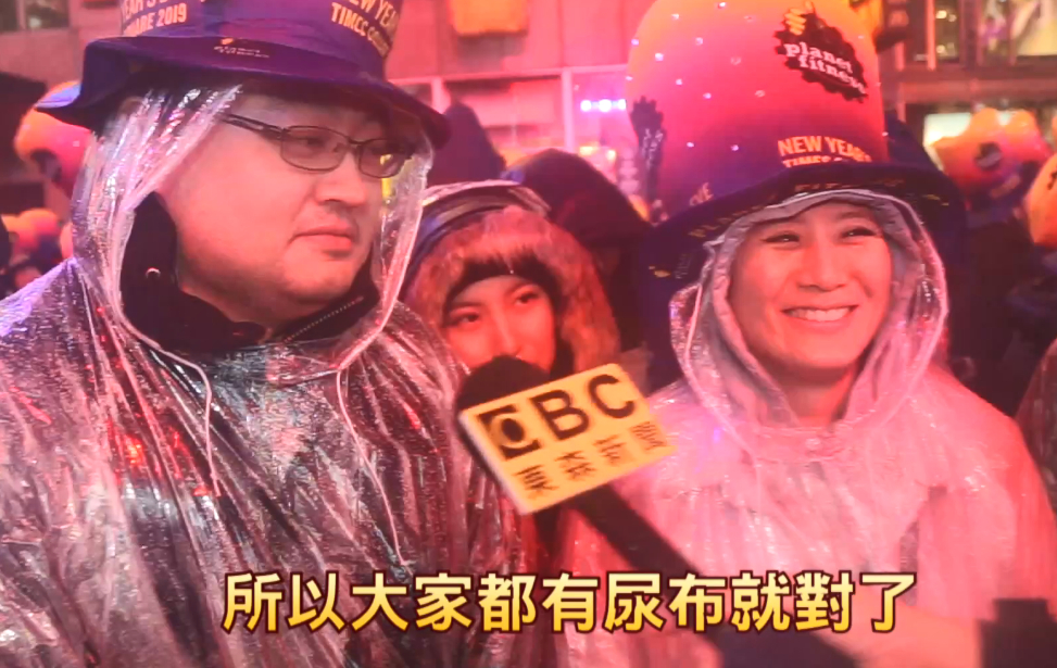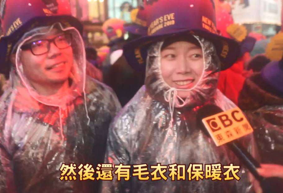 紐約民眾:「54321,新年快樂!」在各大主流媒體人員按下按紐,和時報廣場數十萬民眾的倒數下,2019年正式來到,今年是20年以來,時報廣場跨年倒數第一次下雨,雖然氣溫只有攝氏七度,但是大雨一直下不停,讓現場的民眾淋成了落湯雞,然而專程從台灣來跨年倒數的民眾,各個可說是有備而來。