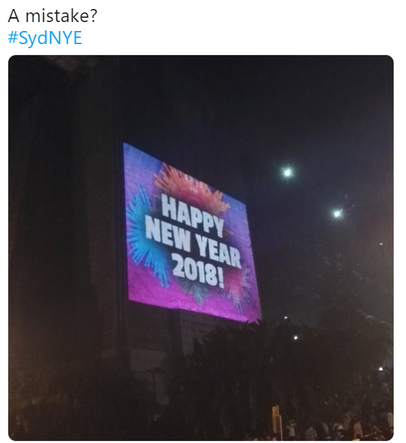 社群媒體網站流傳煙火秀打出錯誤年份的照片。一名推特用戶俏皮地表示:「雪梨指現在還是2018年,我要上床睡覺了」。