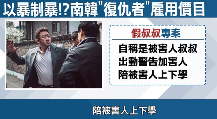 這種報復加害者的商業服務,最常見的就是「假叔叔」專案,業者會派出身材魁梧的大叔陪被害人上下學,甚至出面擺平爭端,一周開價350萬韓元,約新台幣9.5萬,南韓校園暴力嚴重等不到法治還公道,家長暗地裡只好找人「以暴制暴」。