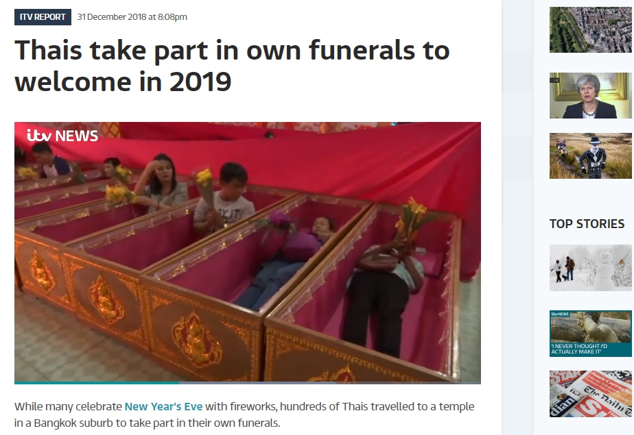 在泰國曼谷郊區的寺廟,為了慶祝新年的到來,特別舉辦「躺棺材儀式」,每個信徒虔誠地手捧鮮花和香,緩緩踏入棺材內並躺下,僧侶則替信徒披上粉紅色布料,同時誦經祈福。