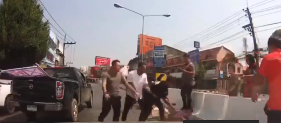 只囂張了30秒!泰國宋卡府一名機車騎士,疑似因不滿在鑽車縫時被一名汽車駕駛按喇叭,竟然趁著汽車停等紅燈時,拿起路旁水泥塊砸破汽車車窗,接著對著車內就是一陣狂打,期間還不斷大聲嗆聲,然而30秒過後,汽車駕駛受不了下車反擊,路過的駕駛和民眾也加入這場混戰,最後機車騎士被圍毆到頭破血流,灰頭土臉的被警方逮捕。