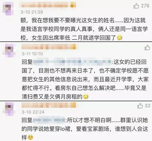 不過,尋人啟事曝光後有同學透露,由於女學生出席率相當低,早在2月就被退學,返回大陸,另外,其他學生也指出,這起事件的確是真人真事,且這名女學生平常喜歡穿著可愛的蘿莉塔式裙裝,也愛參加文藝活動,根本無法聯想到她的生活習慣如此差勁。消息曝光後,不少大陸學生相當無奈,因為部分日本房東本就相當排斥大陸租客,想租房不僅得找日本人當擔保人,還得付出高保證金,現在就連同胞房東都遭殃,紛紛留言「估計以後沒房子住了」、「就是因為這幾顆老鼠屎,你屁股一拍回國了,這麼多在日留學生工作者卻要為你的行為承擔後果和罵名」、「這是前人砍樹,後人遭殃的典型案例」。