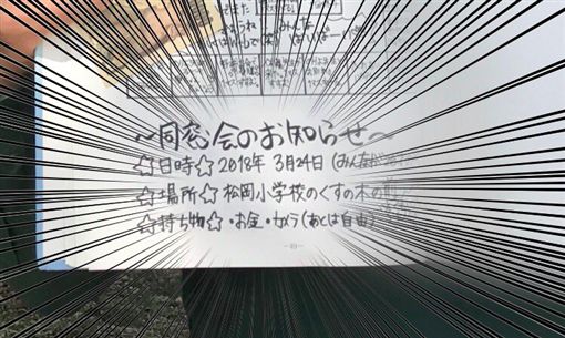 ▼冊裡寫著「在2018年3月24日,於大分市松岡小學的樹木前,帶現金和相機辦同學會」。(圖/翻攝自西平善二郎推特)