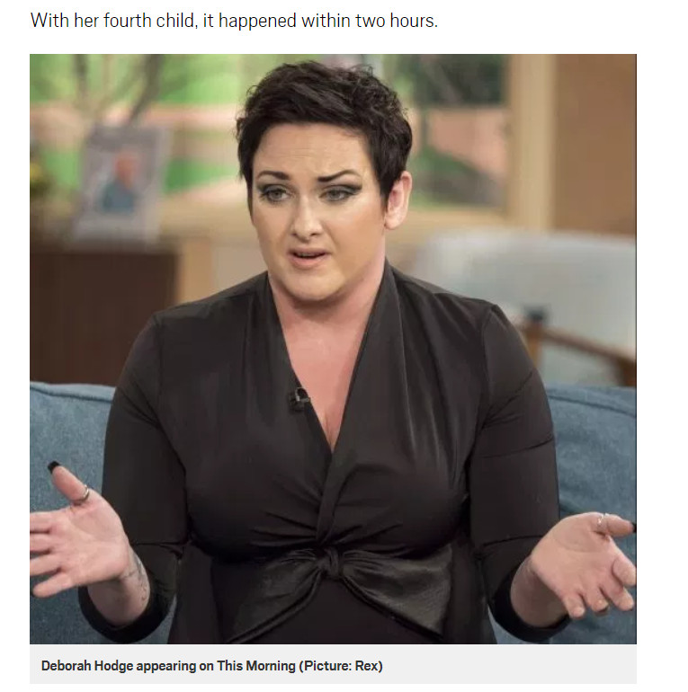 綜合外媒報導,現年44歲的黛博拉(Deborah Hodge)在節目上分享與小15歲男友在產後做出的瘋狂舉動,她在2013年7月25日生完第4胎,39歲的她完全沒想到還會懷孕,「年紀這麼大了,而且我的生理期又很不穩定」,當時已經晚了預產期4天,她在醫院中待產,突然被醫師告知,肚中的胎兒血壓有點高,需要緊急剖腹,2個小時後順利生下小女兒愛蜜莉亞(Amelia),接著被安排到一間恢復室休息,當時嬰兒躺在保溫箱,男友則在床上摟著她,「我還沒意識過來,就開始翻雲覆雨了」。