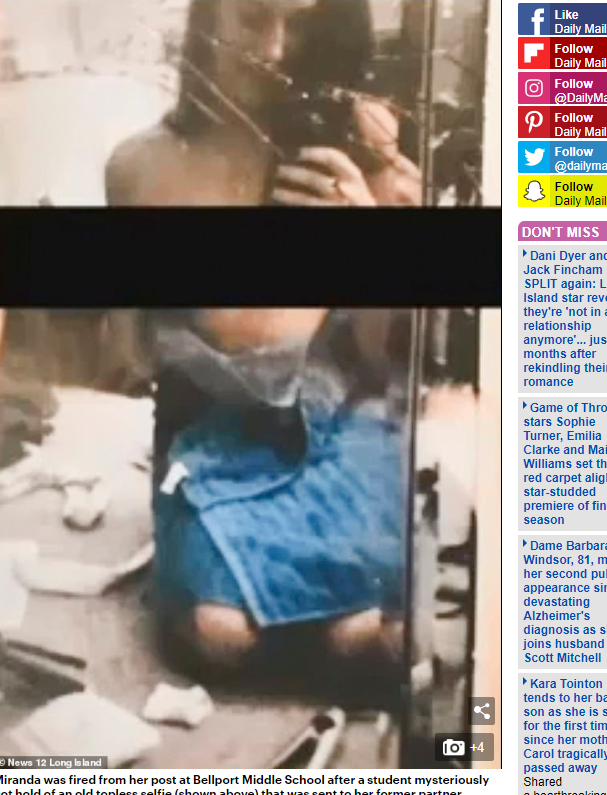 據《每日郵報》報導,米蘭達2015年進入貝爾波特中學(Bellport Middle School)教數學,平時教學表現優異。當時她正和一名男老師交往,並在2016年在臥室拍了一張美胸裸照發給對方,但當初只傳給男友的私密照,隨後不知為何原因,竟流到了男學生手裡,校方後來以「行為不檢、榜樣不佳」為由將她開除。