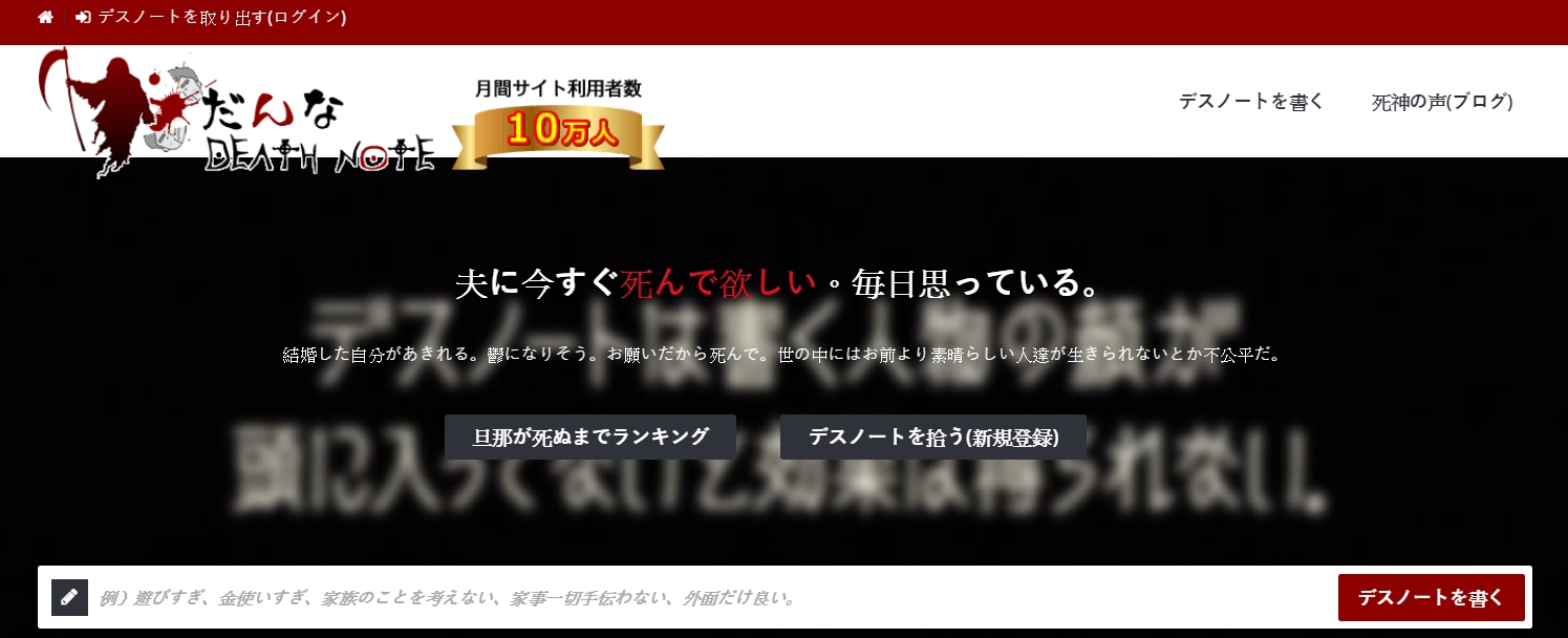 模仿動漫死亡筆記本的故事設定,這個網站,讓人妻寫下對老公的種種不滿,雖然只是宣洩管道,不是真的要讓人夫去死,但也能從這裡看出,日本男性在家中,尤其是在太太心中的地位。