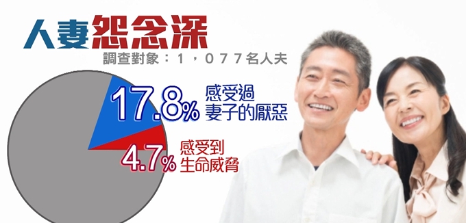日本內閣府,也曾針對1077名人夫進行調查,當中有17.8%表示,自己感受過來自妻子的厭惡,還有4.7%,說自己曾覺得生命受威脅。